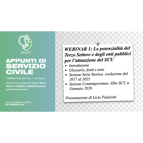 ASC Nazionale APS avvia nel 2026 un percorso di approfondimento dedicato all'attuazione del Servizio Civile Universale, con particolare attenzione alle potenzialità di partecipazione del Terzo Settore e della Pubblica Amministrazione.