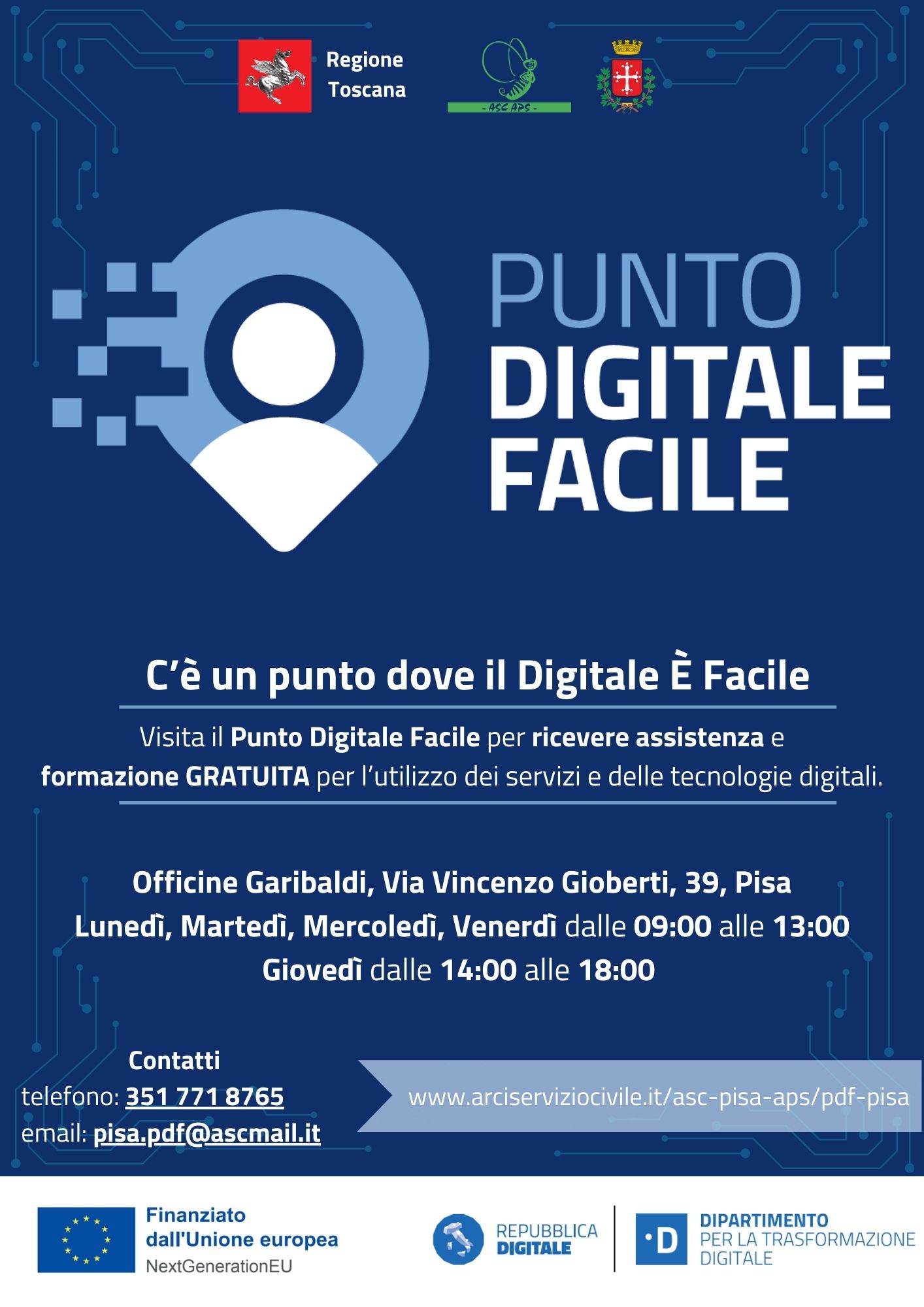 A Pisa lo sportello è aperto presso le Officine Garibaldi, Via Vincenzo Gioberti, 39 e segue i seguenti orari: Lunedì/Martedì/Mercoledì/Venerdì 9.00-13.00 e Giovedì 14.00-18.00.