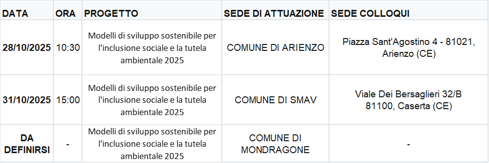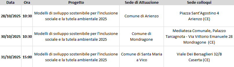 Si ricorda che “La pubblicazione del calendario ha valore di notifica della convocazione a tutti gli effetti di legge e il candidato che, pur avendo inoltrato la domanda, non si presenti al colloquio nei giorni stabiliti, senza giustificato motivo, sarà da considerarsi escluso dalla selezione per non aver completato la relativa procedura.” (Art. 6 del Bando Servizio Civile - Bandi tematici e autofinanziati 2025)